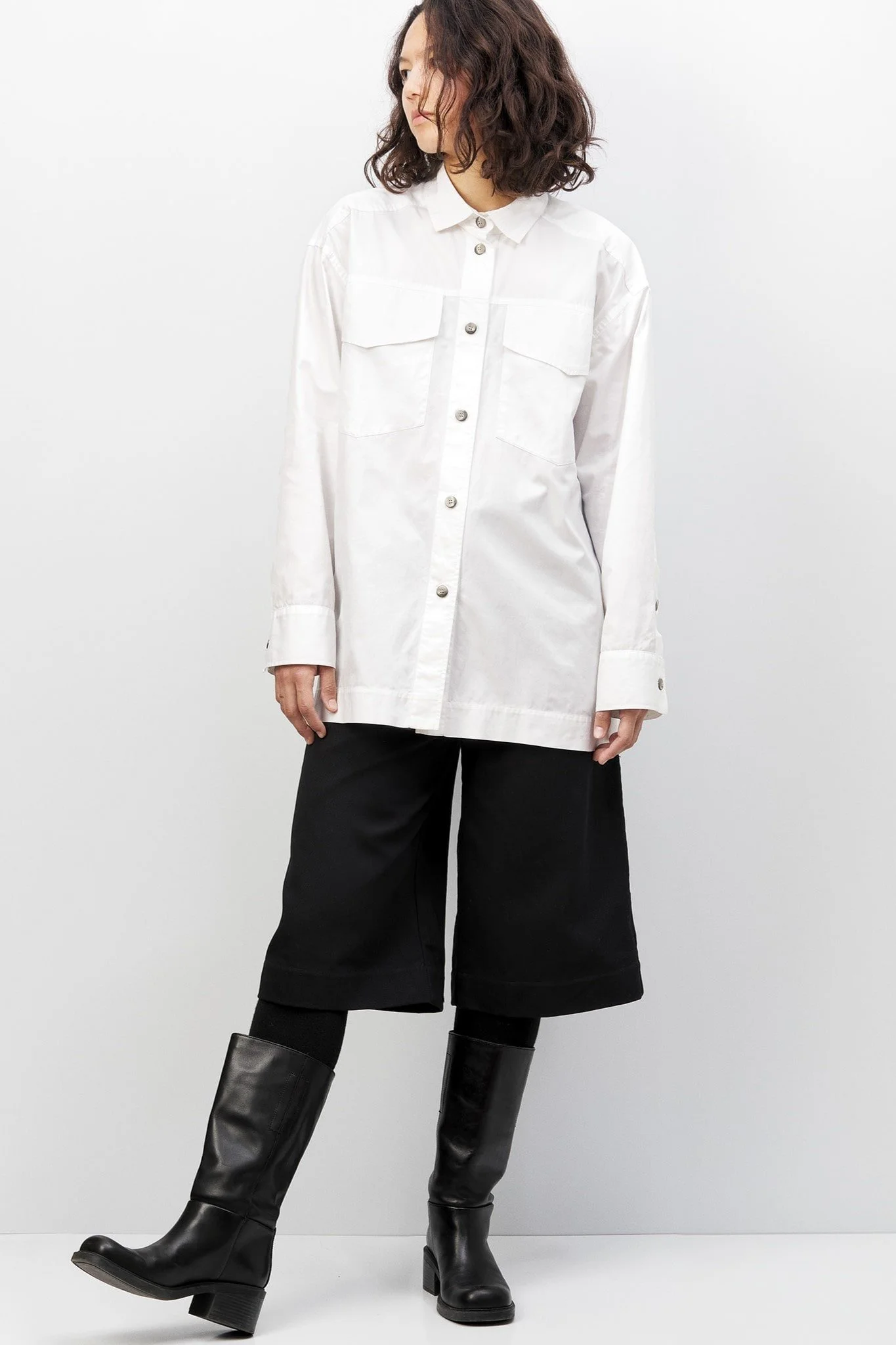 Loose tunic blouse in white cotton twill with shirt collar, front patch pockets and flaps. Very long sleeves with wide cuffs. If you are between two sizes, take the size below.